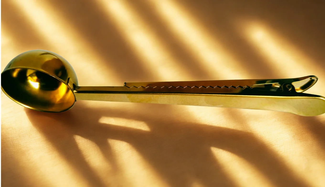 Cuchara medidora café pinza color dorado. Cuchara para preparación y cierre hermético de la bolsa. Utensilio útil para medir la cantidad de café en grano y molido para la preparación y para cierre de la bolsa para almacenamiento. El precio no incluye el envío.